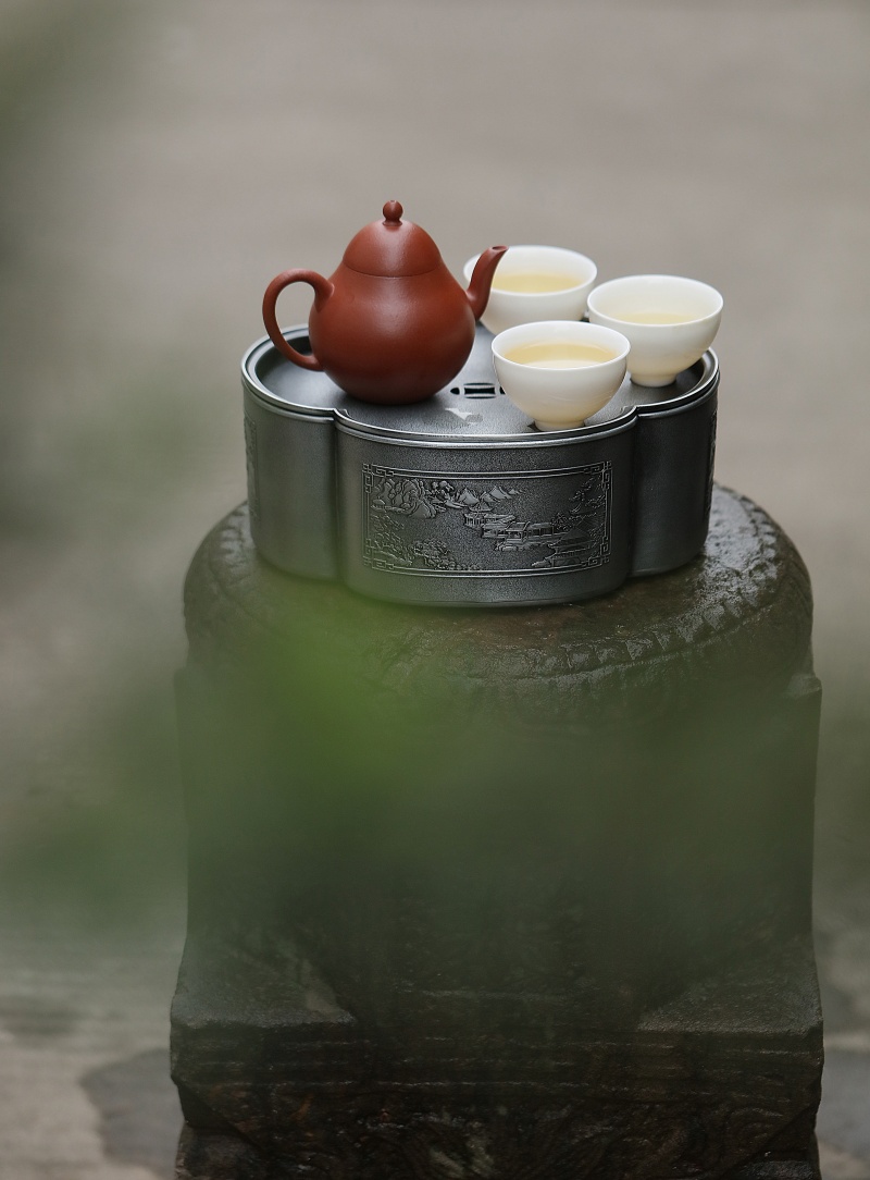 可谓工夫茶器极具代表性的一种,有效的蓄水功能,减少水盂方的佔位,同时置壶与杯便捷使用且能适时淋壶烫杯加温,
