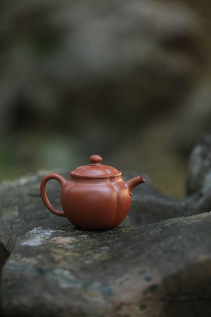 如春日海棠,生机勃勃,小巧灵动。花瓣筋囊壶身,筋纹流畅贯穿,筋纹异型口盖,压盖完美贴合,气密性良好。直嘴出水畅快,耳把舒适握持,壶钮捏取轻便,朱泥细腻光润的质感油然而生,细密亲肤,精美雅致,既耐看又实用。100cc小品壶,以其独特韵味,紧紧锁住茶香,令人回味无穷。