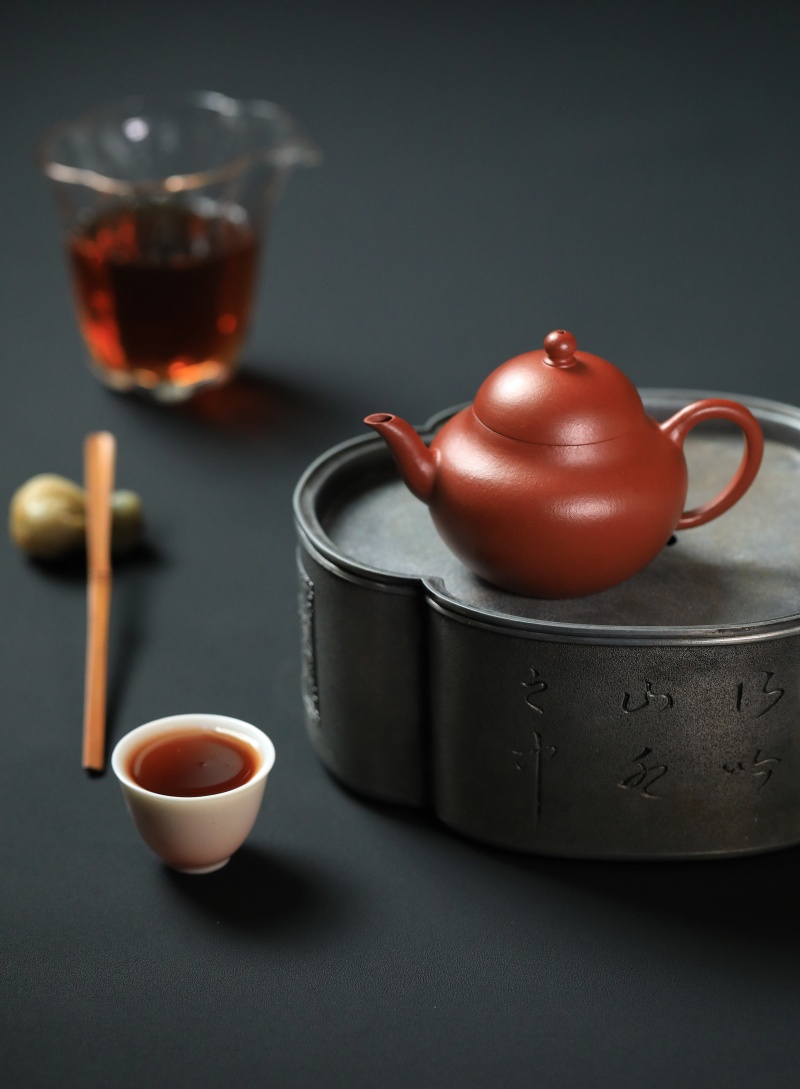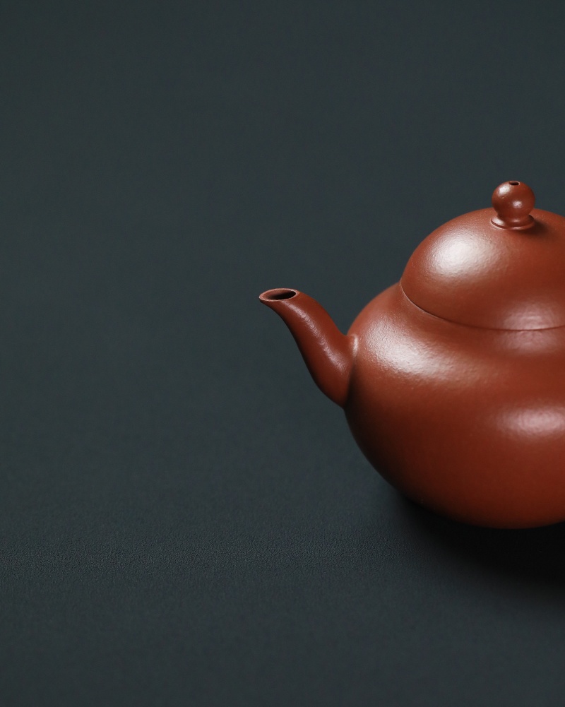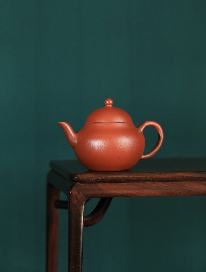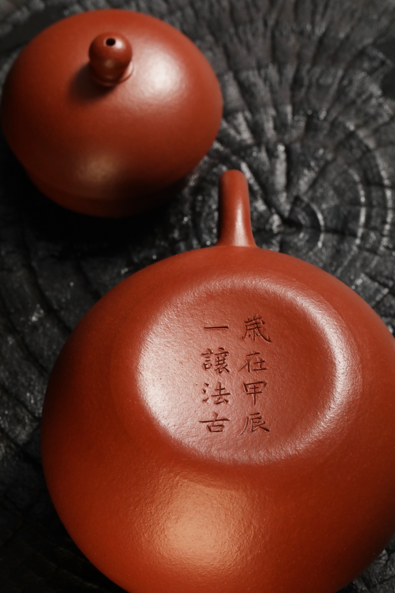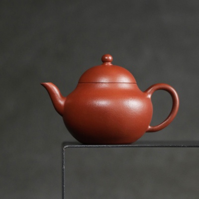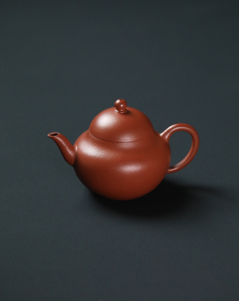 锦堂发记为贡局制作之代造商号,朱泥壶落款以楷书刻以内墙,其产品以工艺精湛、设计雅致著称。九瀚此次摹古锦堂款梨式壶,朱泥全手工制作,壶身作梨式,器型上敛下鼓,饱满圆润,平底内圈,壶流三弯式,圈把秀巧,朱泥胎质细密,雅艳动人,透气性佳。容量适中,既适合单人品茗,也能满足茶友会小聚需求。