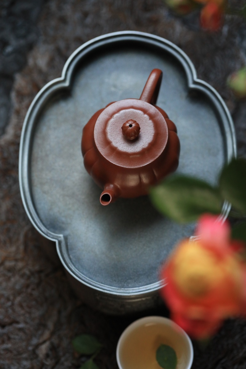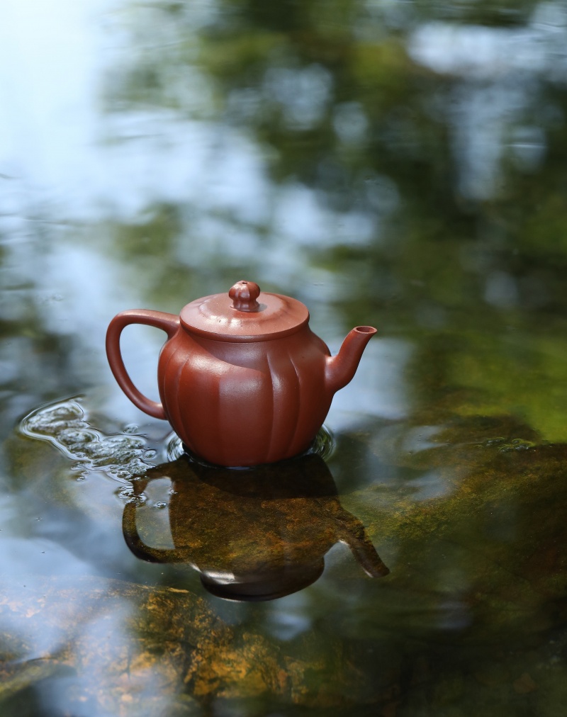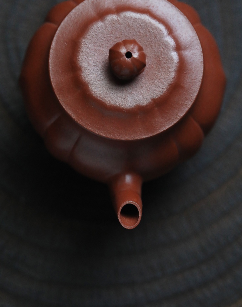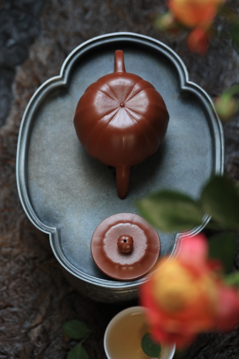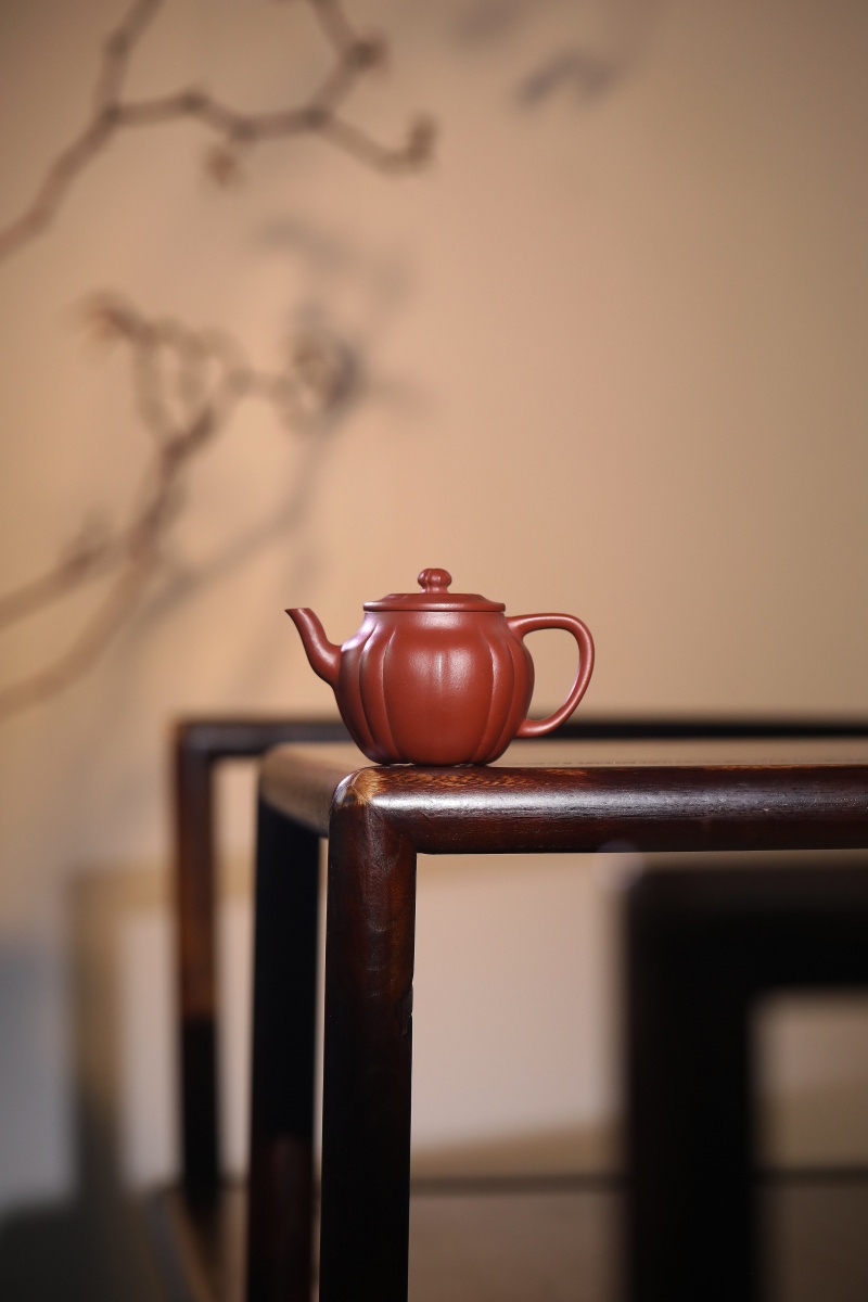 取水仙与菊花清雅高洁之质入器,壶身以筋纹细致呈现花瓣之秀韵,流露恬淡从容之美。水仙之幽静与菊花之清逸,于壶形间交映融合,隐隐透出文人气息与宁静之境。壶把水平舒展,手握之际稳雅自如,映衬茶韵之悠远与清芬。“萃香”之名,蕴含群芳萃聚之妙,香韵含蓄内敛,品茶之间更添意趣深长。正如诗云:“众葩微萃香蕴内,手执芳华韵绵长。”