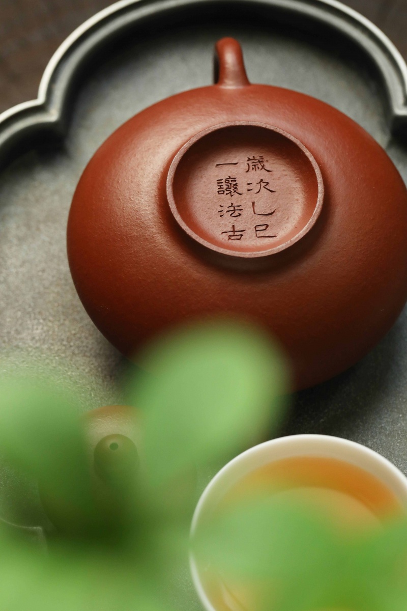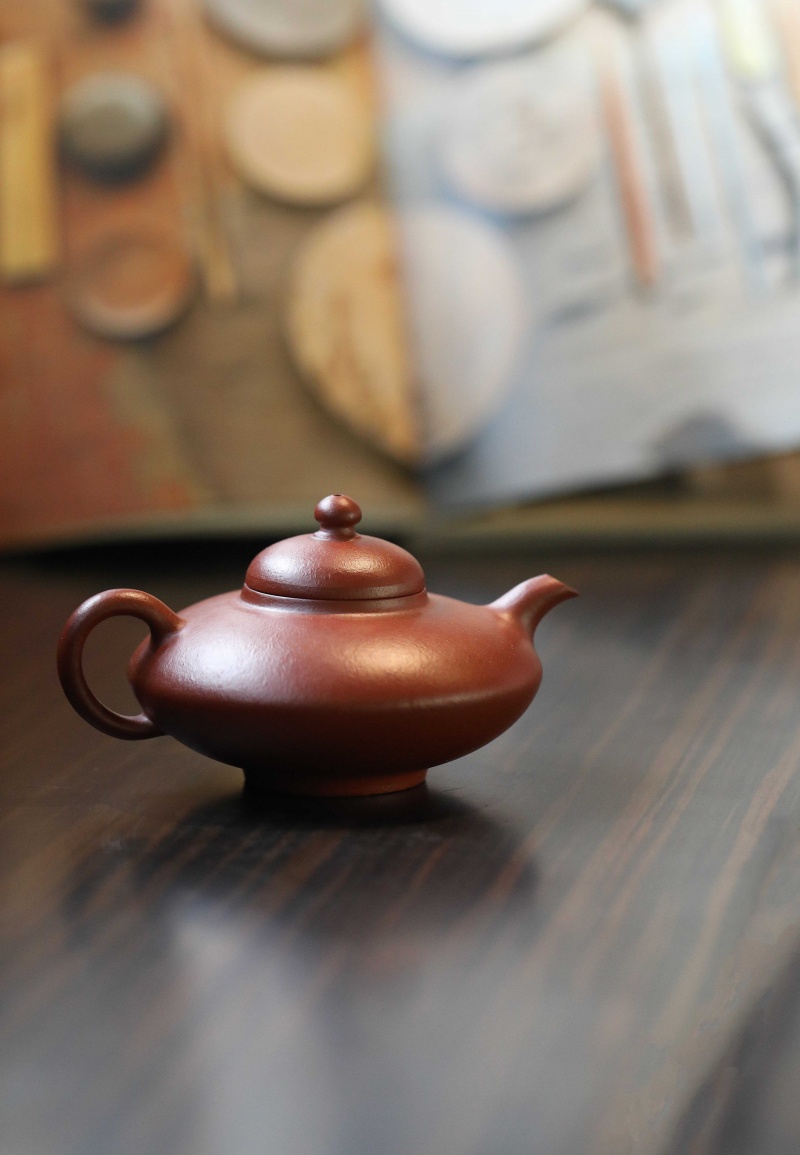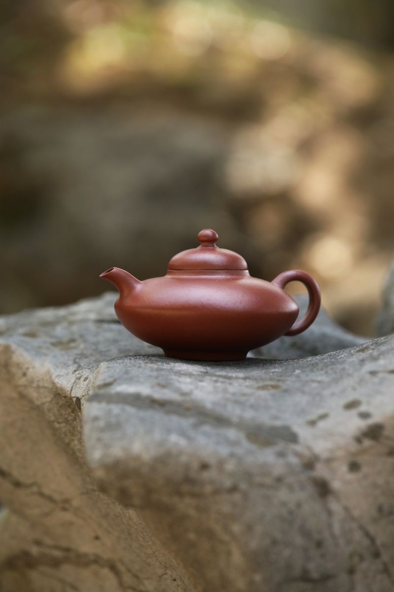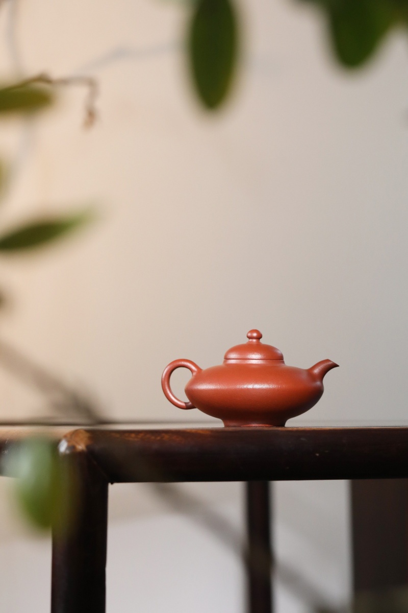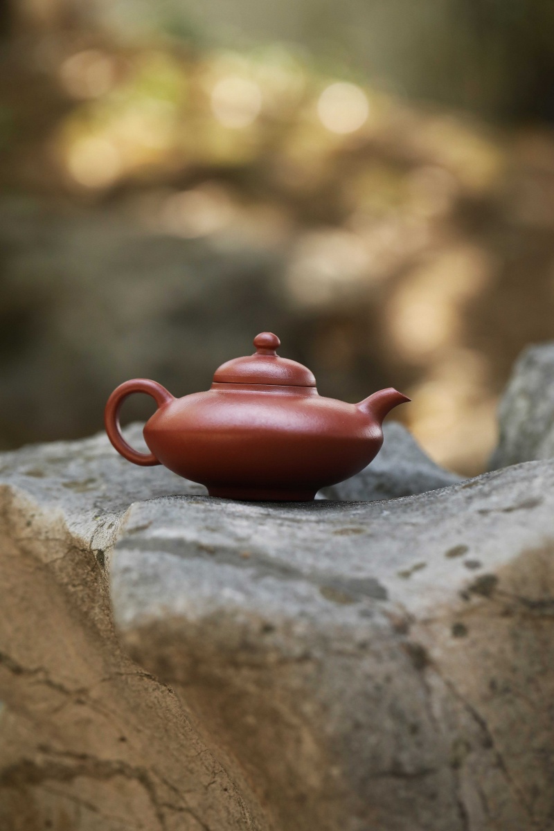 九瀚专注经典传承,摹造朱泥精品。合欢壶取意曼生旧式,于古法中见新意。此款摹古合欢式,全手工制作,器型古韵而又张力,壶身取两半弧线,一俯一仰,阴阳相合,暗合“合欢”之雅意。形制饱满圆融,线条简净大方,无赘饰而气韵自足。壶嘴挺拔,壶把流畅,矜持有度。抚之温润,玩之有味,既得传统壶艺之精神,亦见九瀚摹古不拘、承中求变的匠心独运。