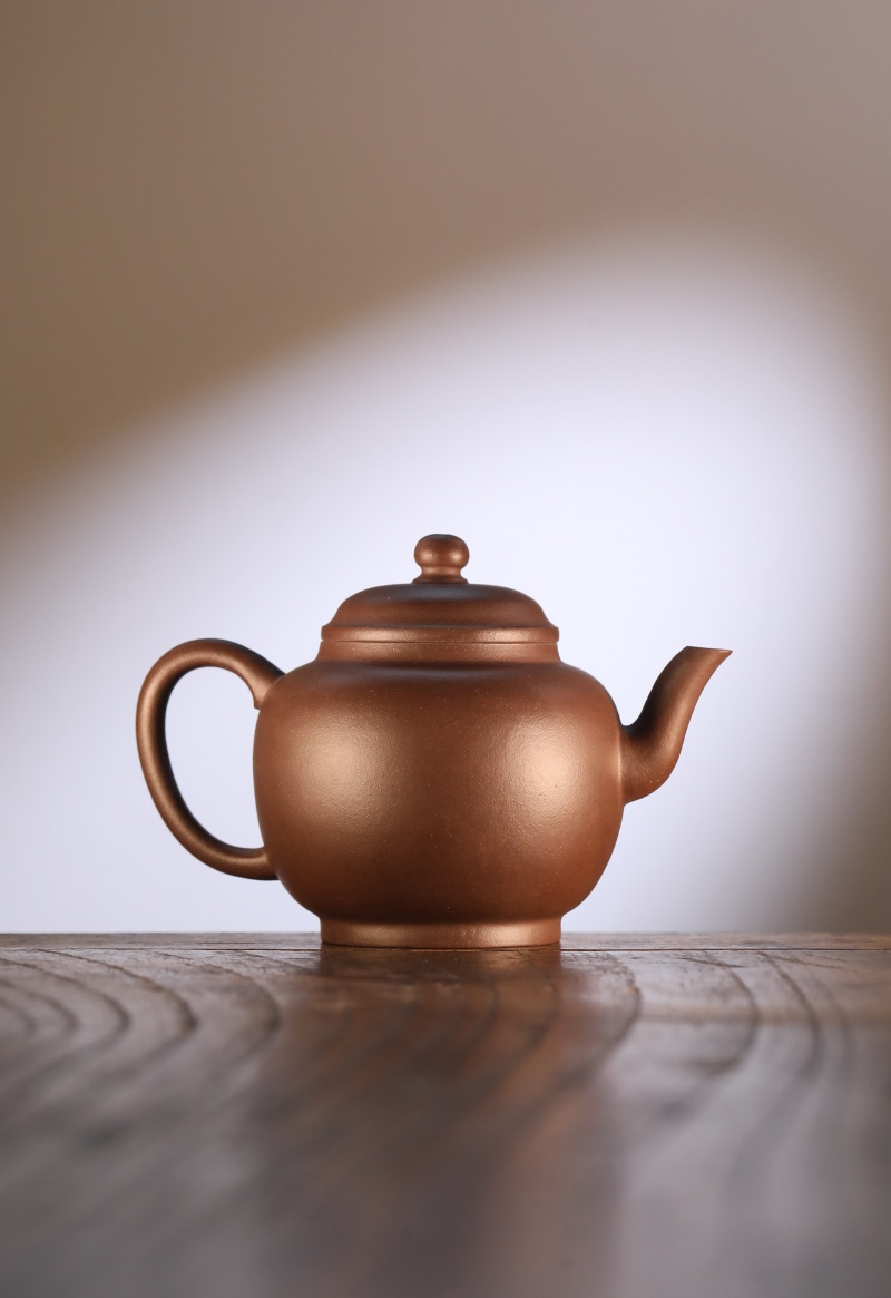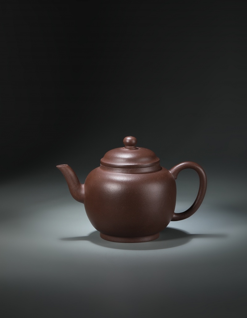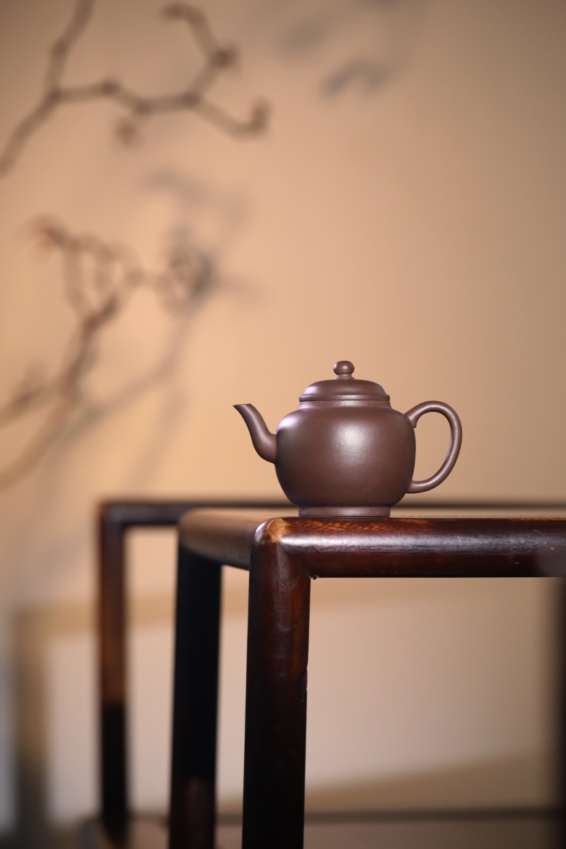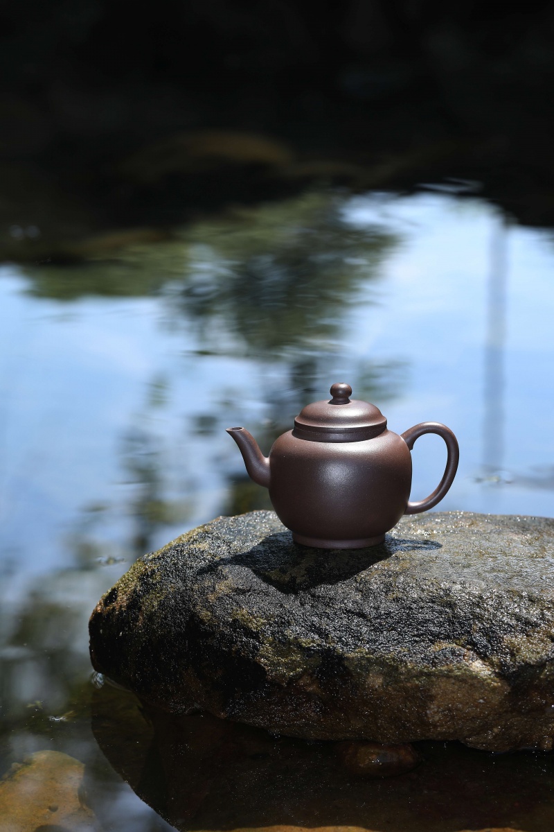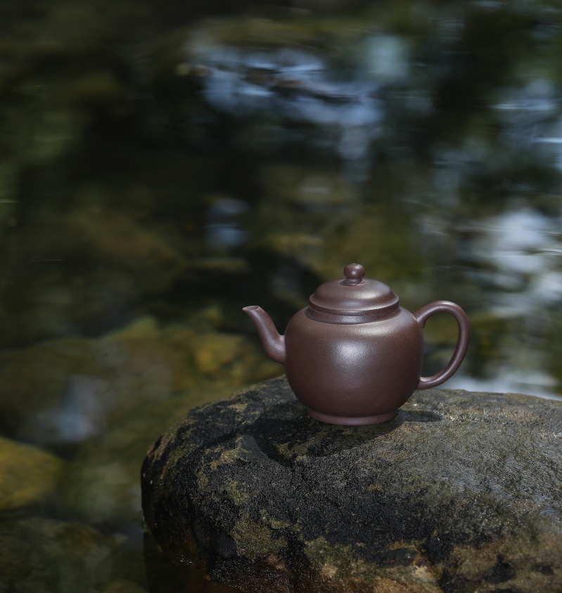 本品摹作台湾成阳基金会旧藏所作,此器全手工匠制,形制典雅古朴,短颈圆肩,弯流圈把相得益彰。选用九瀚旧藏茄紫泥,砂料呈色丰富,成品气质稳重柔和,古拙韵味与砂感兼具。流把设计纤细灵动、一气贯通,尽显干净利落,其出水流畅,特为事茶断水收水更佳。
