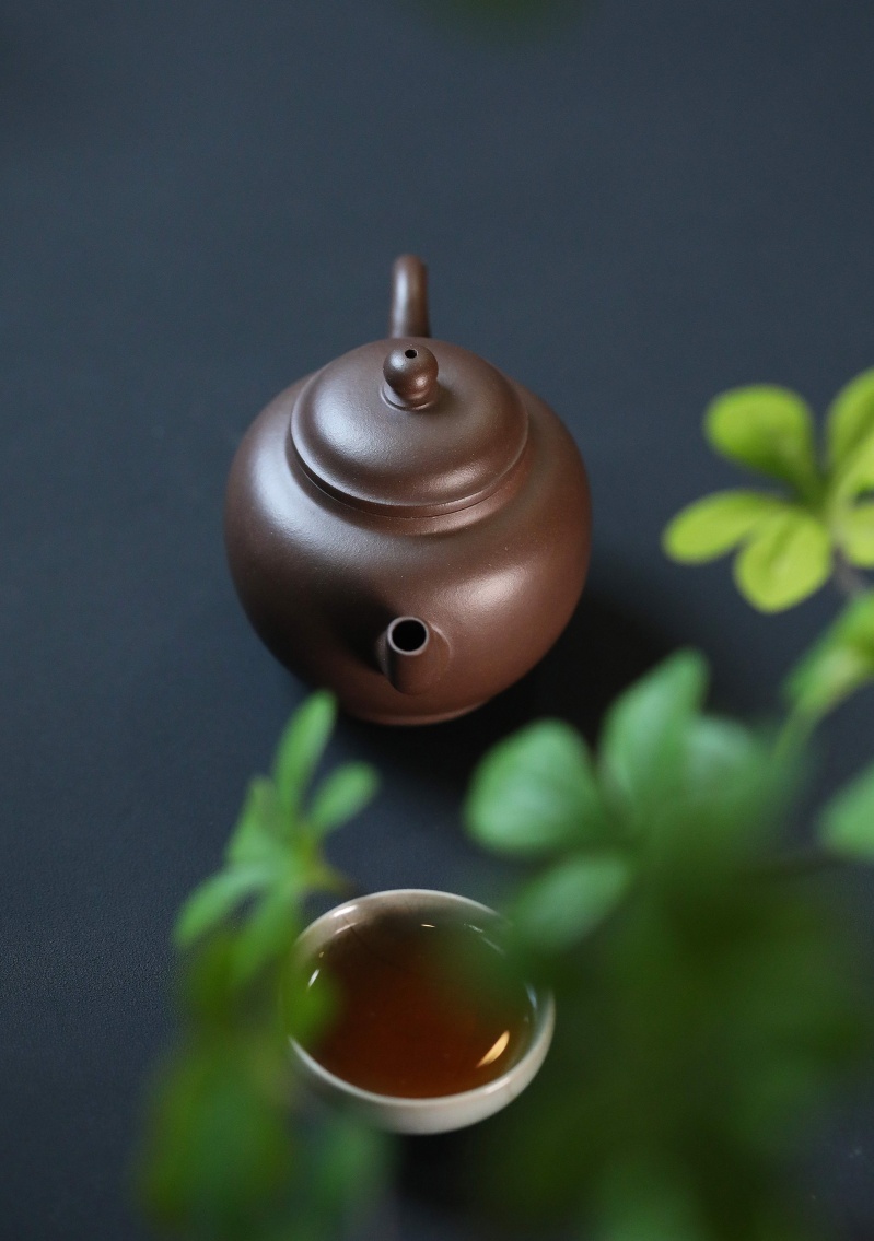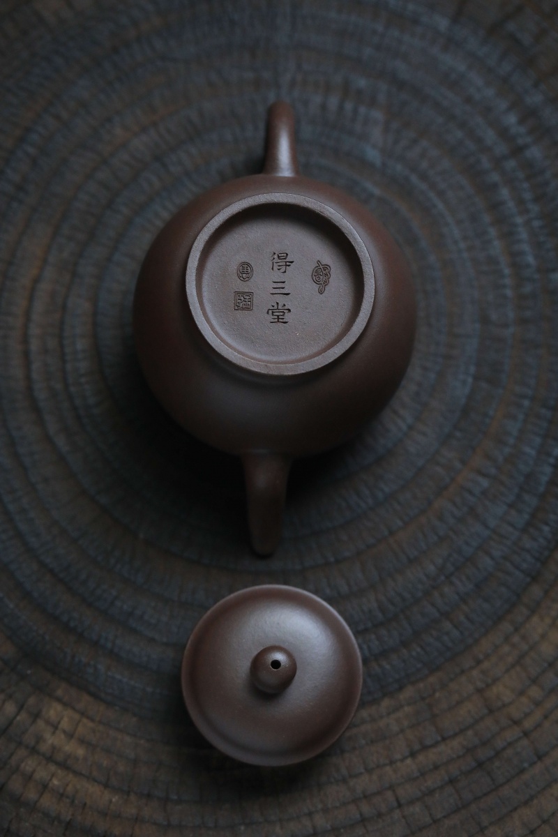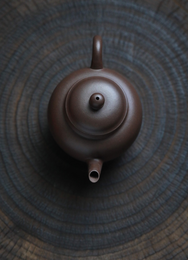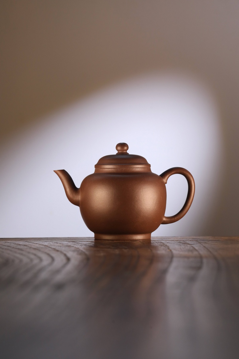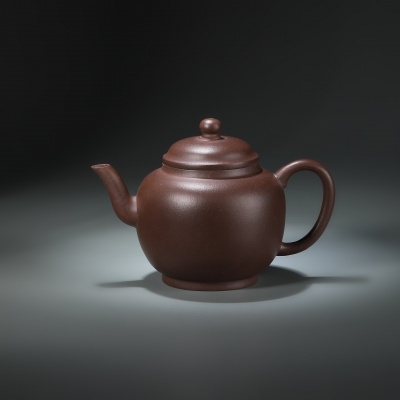 本品摹作台湾成阳基金会旧藏所作,此器全手工匠制,形制典雅古朴,短颈圆肩,弯流圈把相得益彰。选用九瀚旧藏茄紫泥,砂料呈色丰富,成品气质稳重柔和,古拙韵味与砂感兼具。流把设计纤细灵动、一气贯通,尽显干净利落,其出水流畅,特为事茶断水收水更佳。