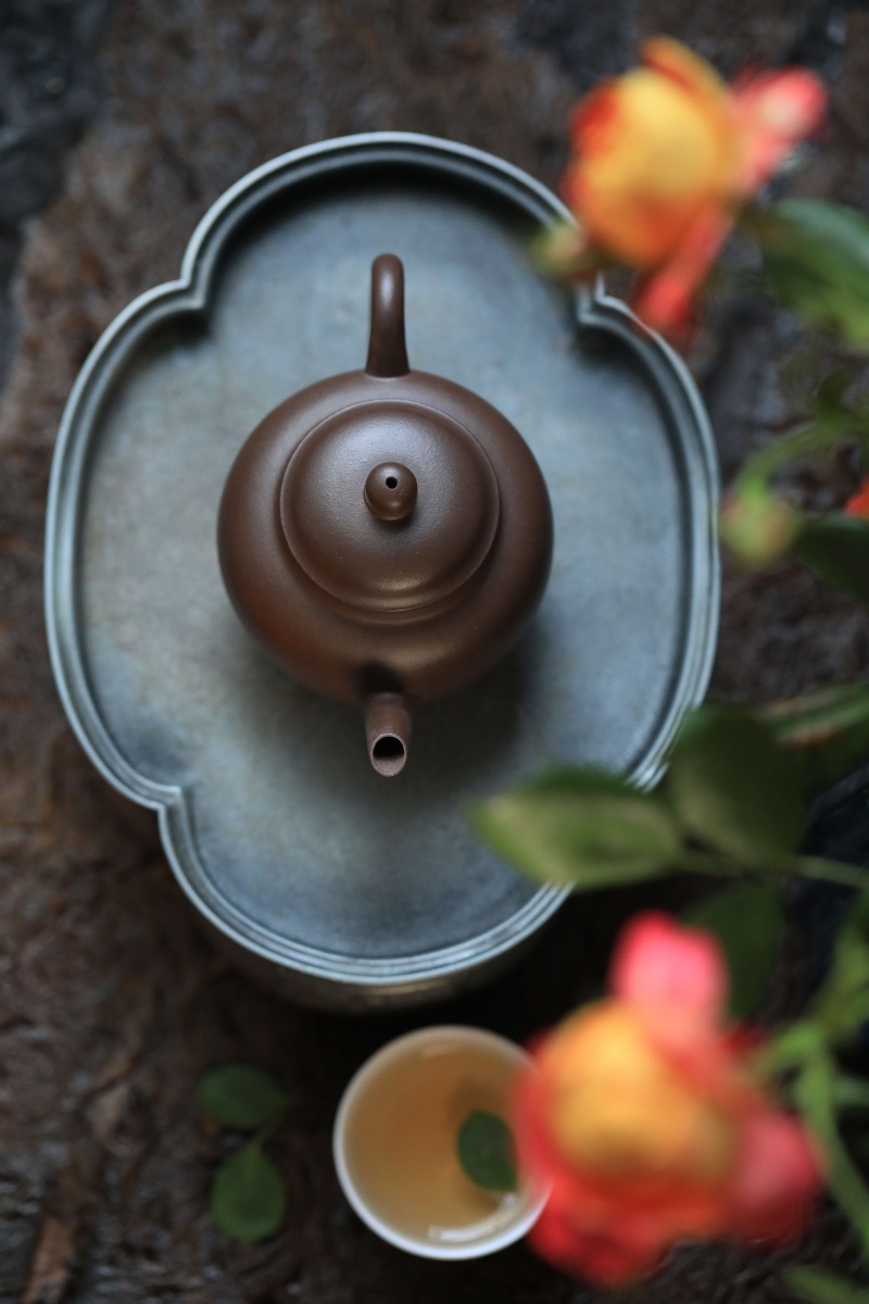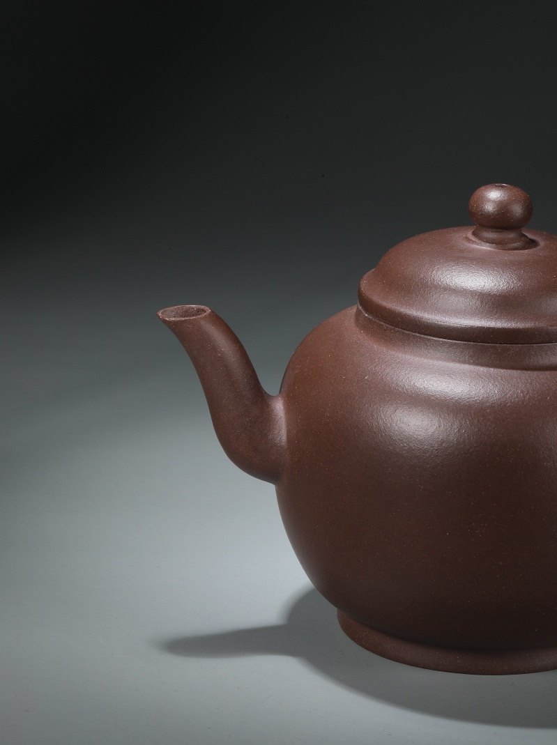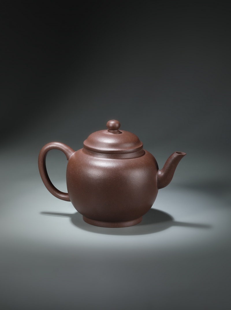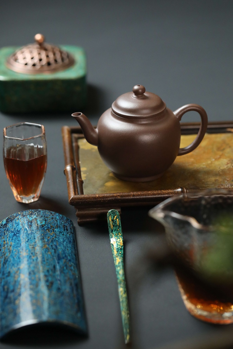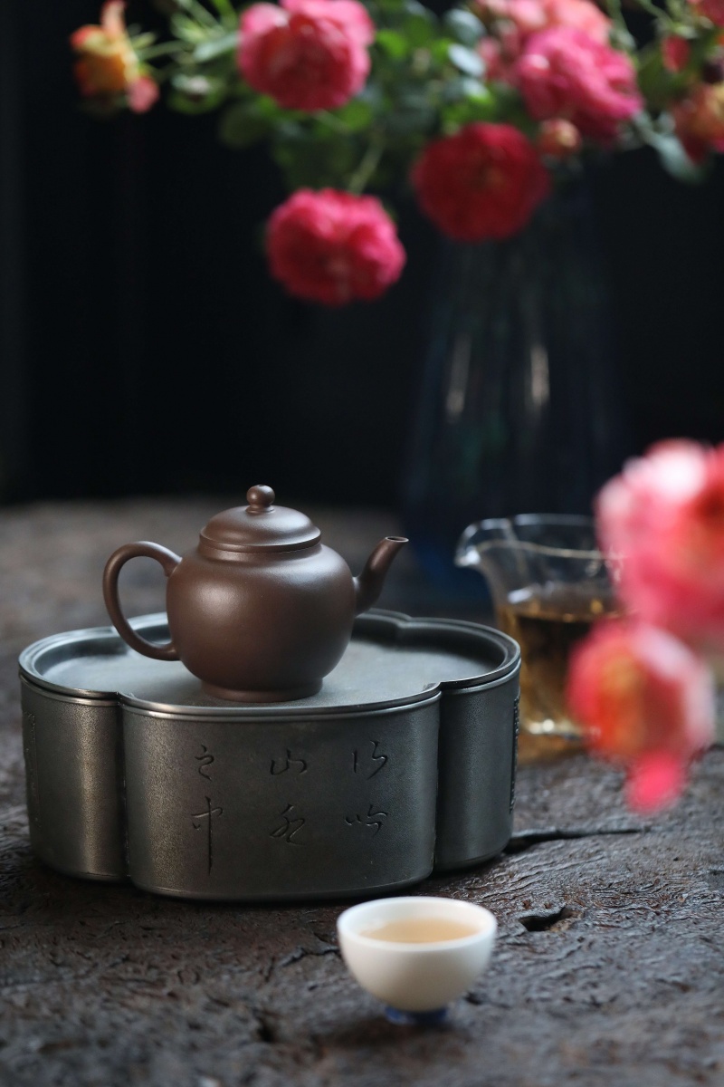 本品摹作台湾成阳基金会旧藏所作,此器全手工匠制,形制典雅古朴,短颈圆肩,弯流圈把相得益彰。选用九瀚旧藏茄紫泥,砂料呈色丰富,成品气质稳重柔和,古拙韵味与砂感兼具。流把设计纤细灵动、一气贯通,尽显干净利落,其出水流畅,特为事茶断水收水更佳。
