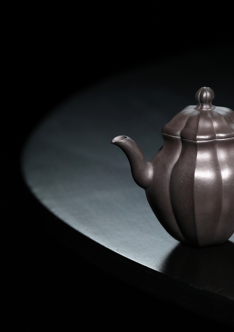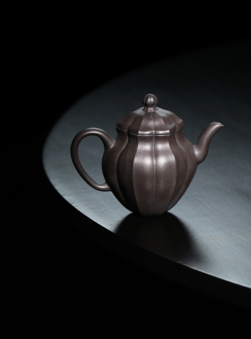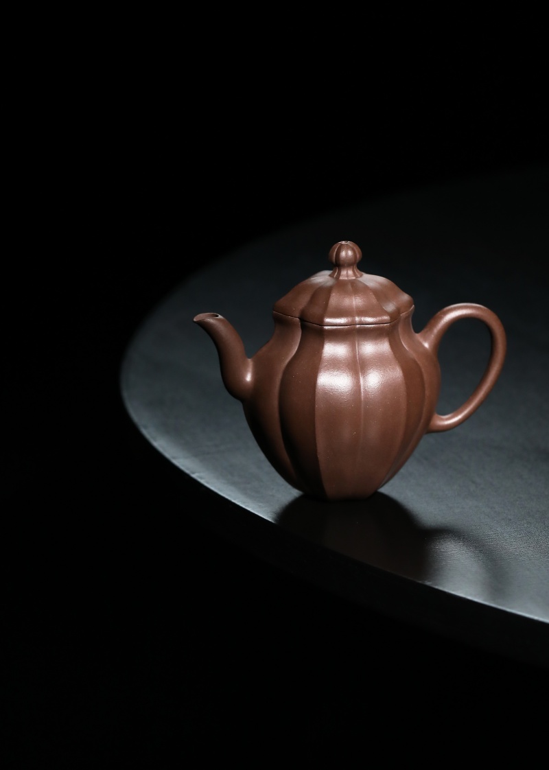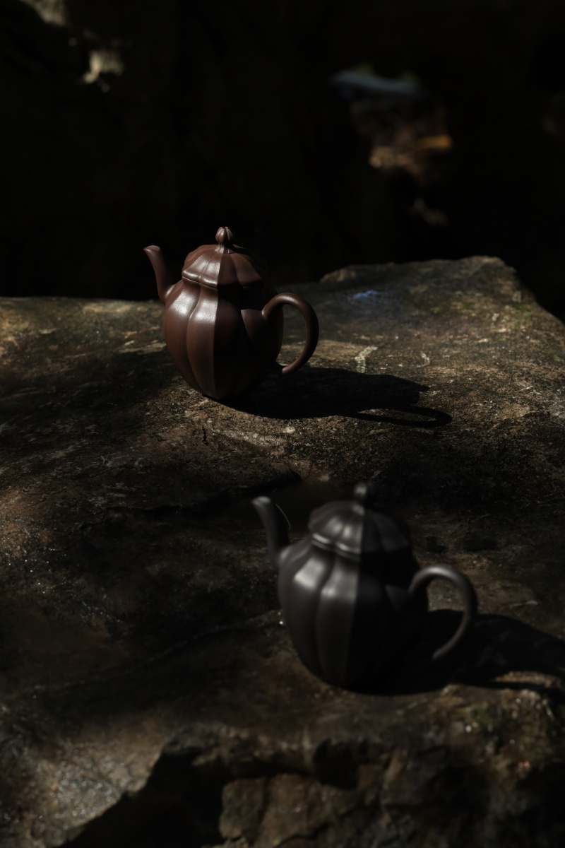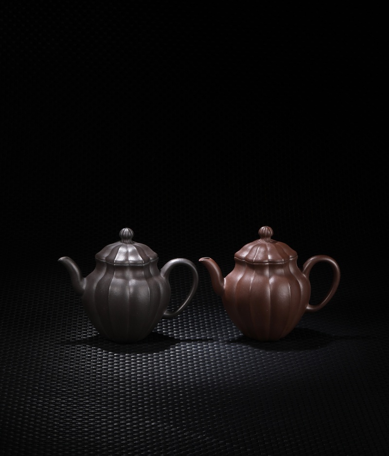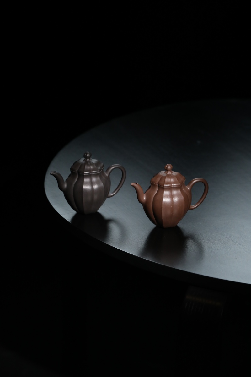 水仙宫灯二式通体呈水仙瓣式,将筋纹与块面巧妙结合,生动呈现出水仙花挺拔且富有生机的姿态。花瓣勾勒细腻,筋纹阴阳交错。整体秀美非凡,柔美中棱角分明,又不失圆润流畅。流把设计纤细灵动,壶底设计巧妙,一点收缩,将全壶筋纹精妙汇聚于壶底中心,其出水流畅,特为事茶断水收水更佳。