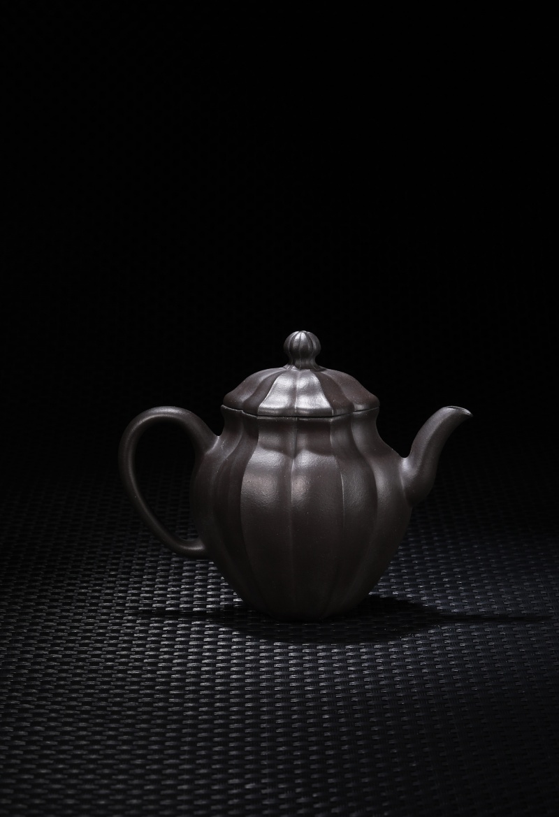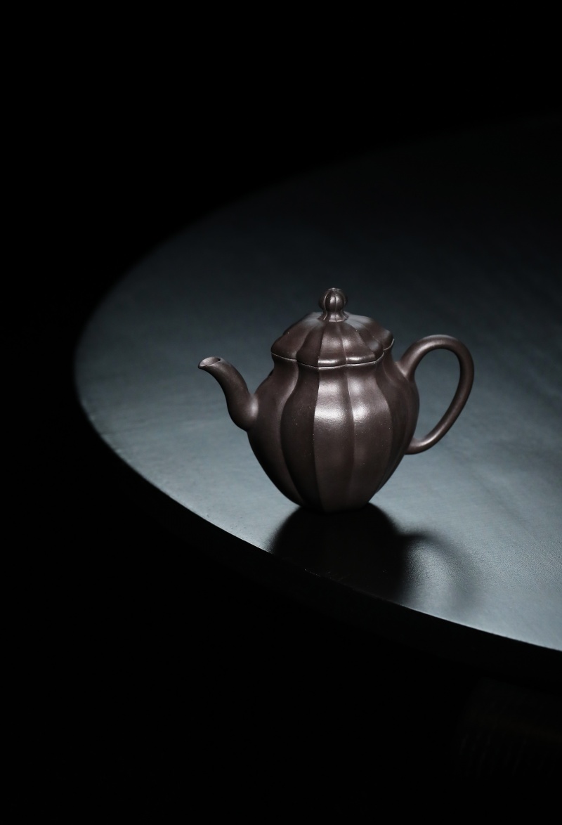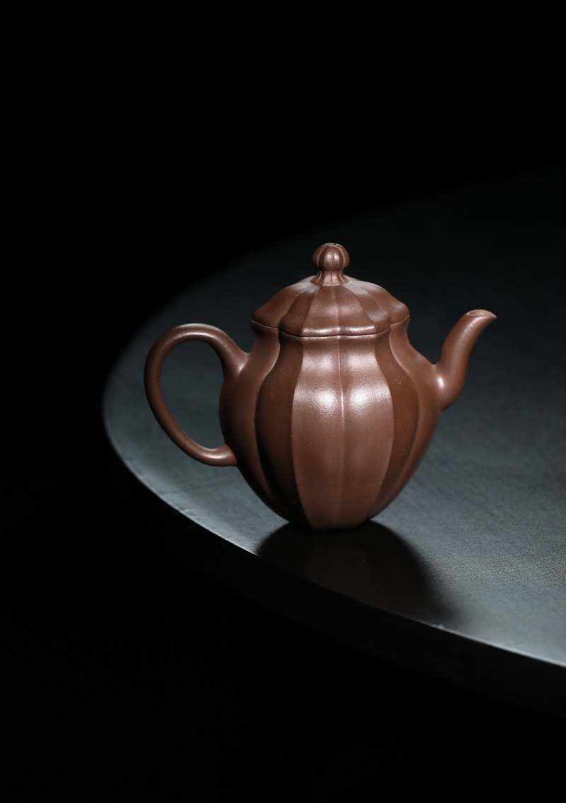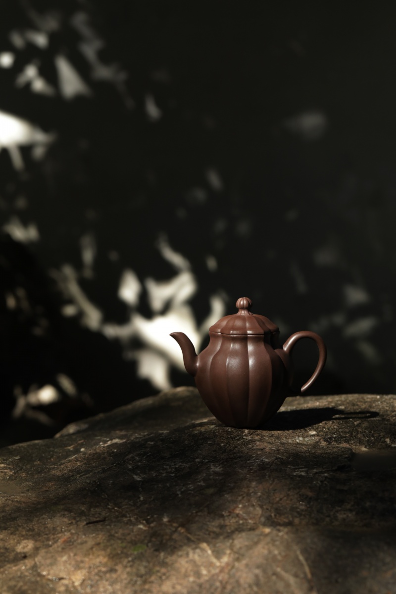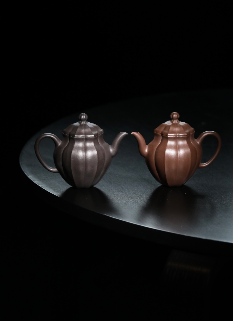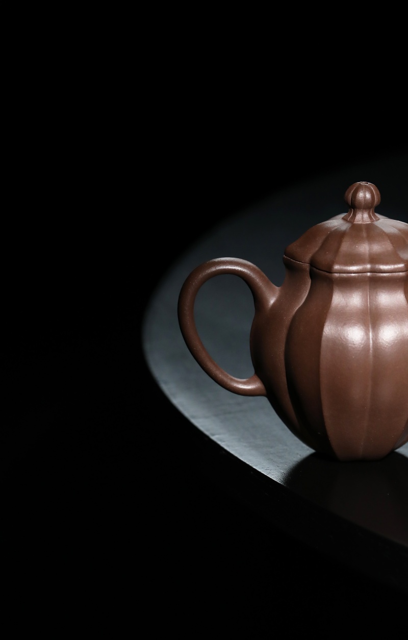 水仙宫灯二式通体呈水仙瓣式,将筋纹与块面巧妙结合,生动呈现出水仙花挺拔且富有生机的姿态。花瓣勾勒细腻,筋纹阴阳交错。整体秀美非凡,柔美中棱角分明,又不失圆润流畅。流把设计纤细灵动,壶底设计巧妙,一点收缩,将全壶筋纹精妙汇聚于壶底中心,其出水流畅,特为事茶断水收水更佳。