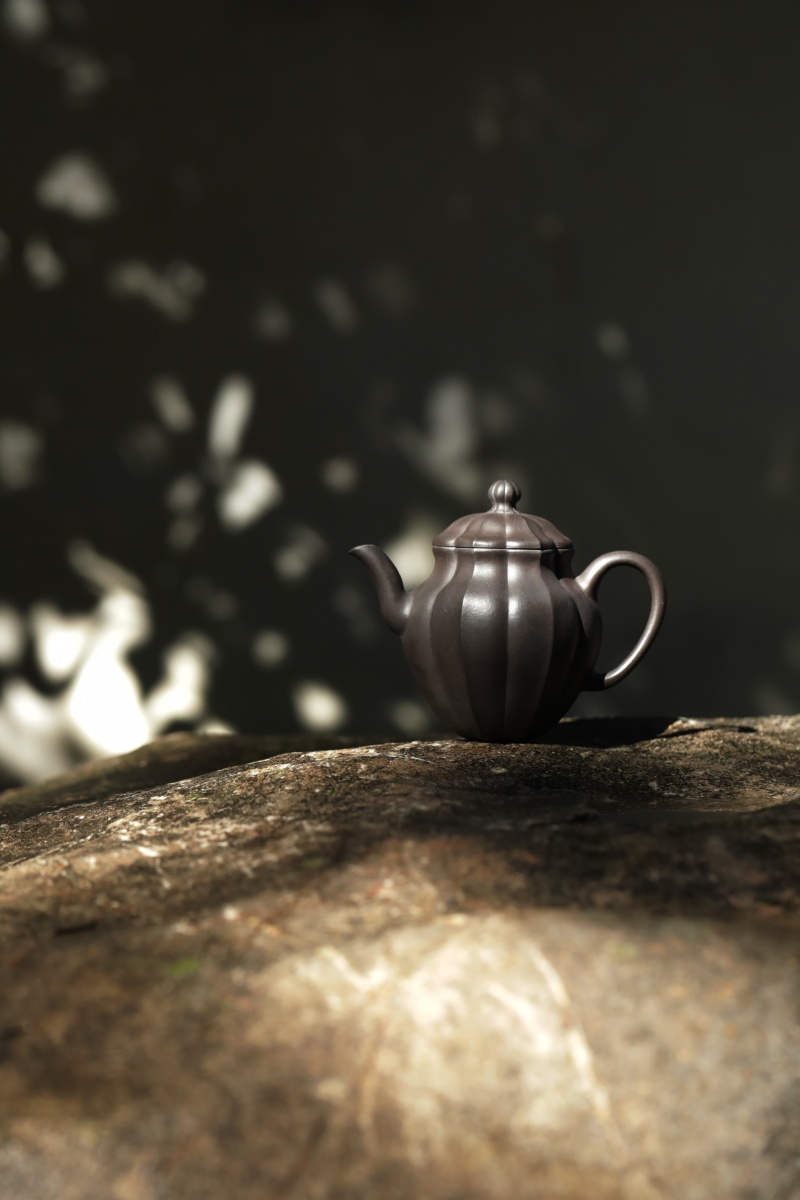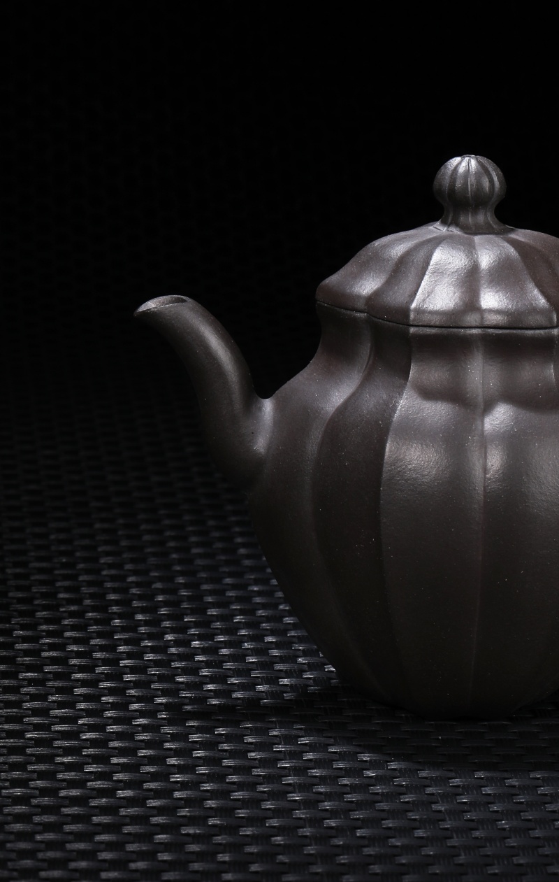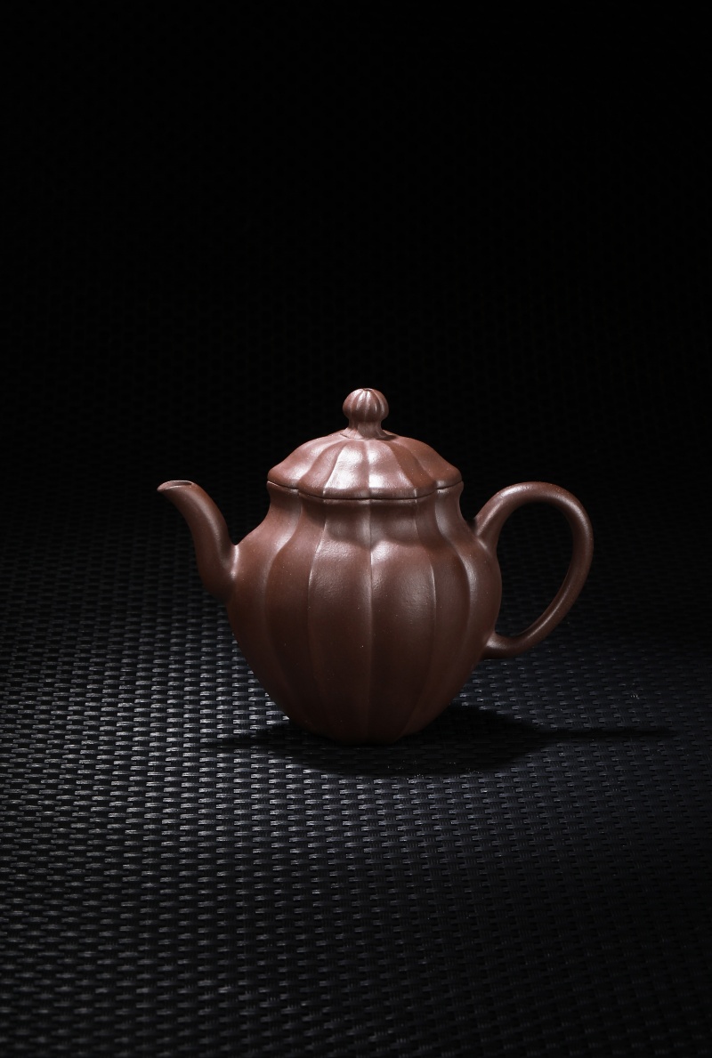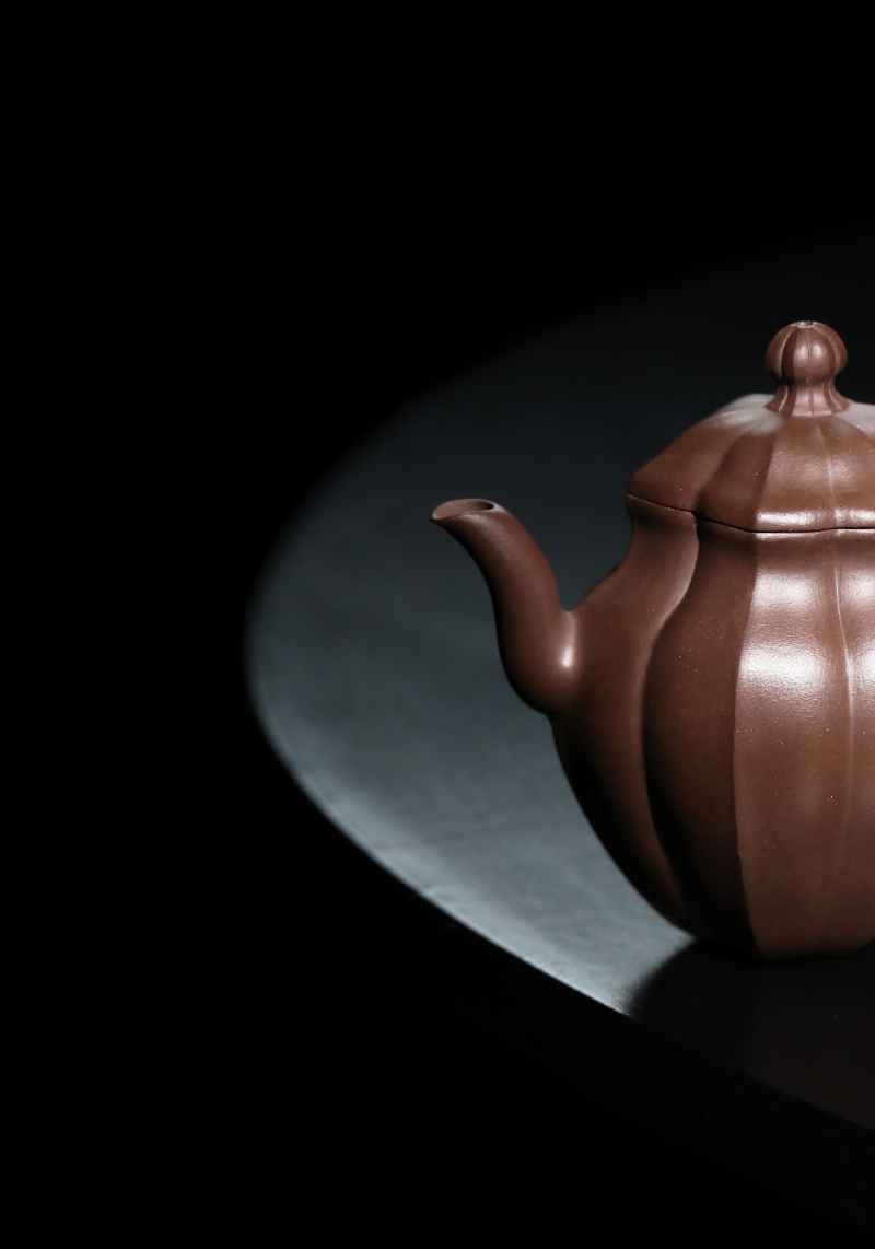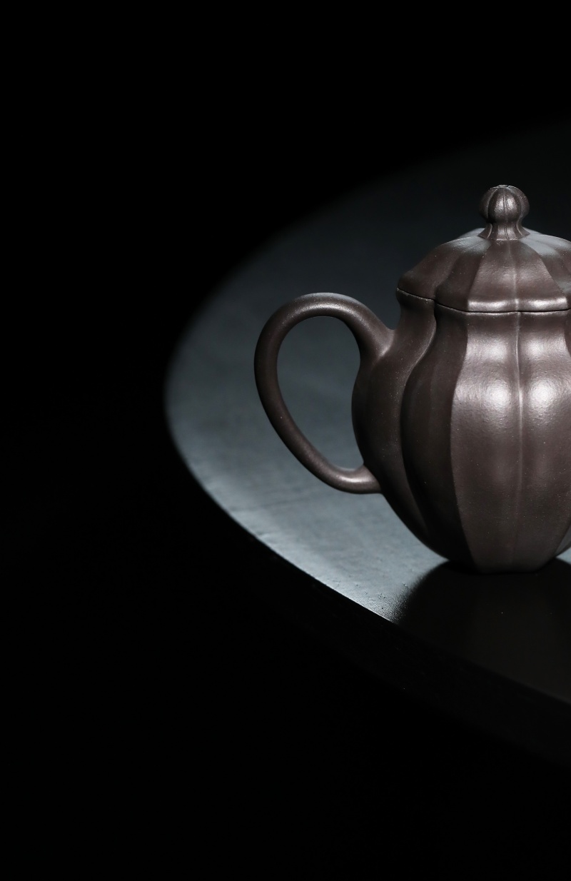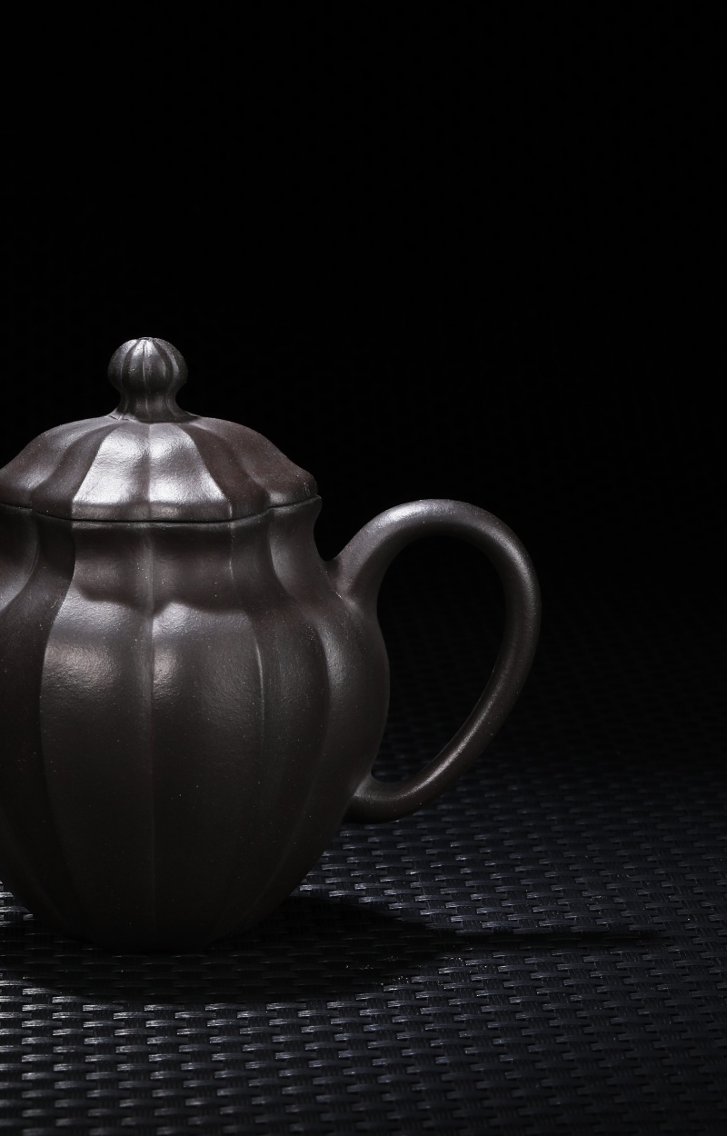 水仙宫灯二式通体呈水仙瓣式,将筋纹与块面巧妙结合,生动呈现出水仙花挺拔且富有生机的姿态。花瓣勾勒细腻,筋纹阴阳交错。整体秀美非凡,柔美中棱角分明,又不失圆润流畅。流把设计纤细灵动,壶底设计巧妙,一点收缩,将全壶筋纹精妙汇聚于壶底中心,其出水流畅,特为事茶断水收水更佳。