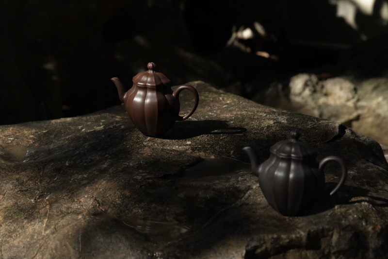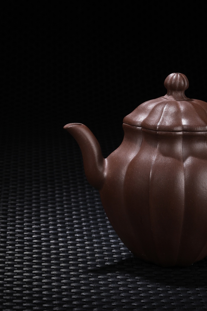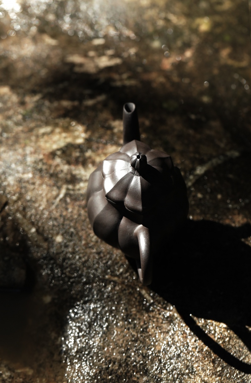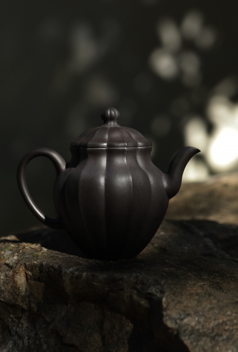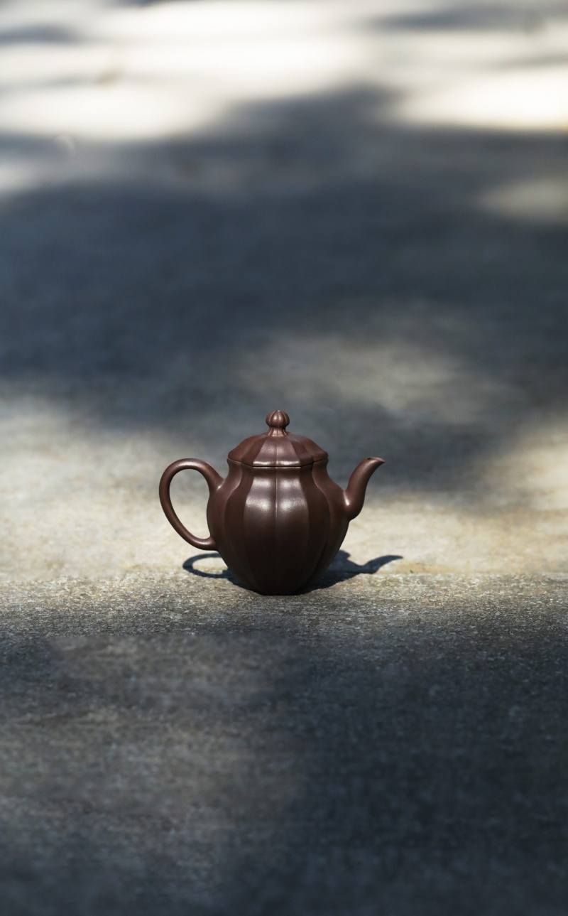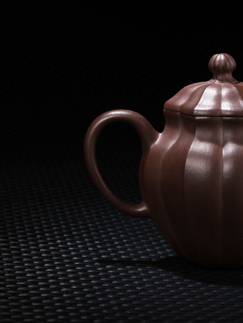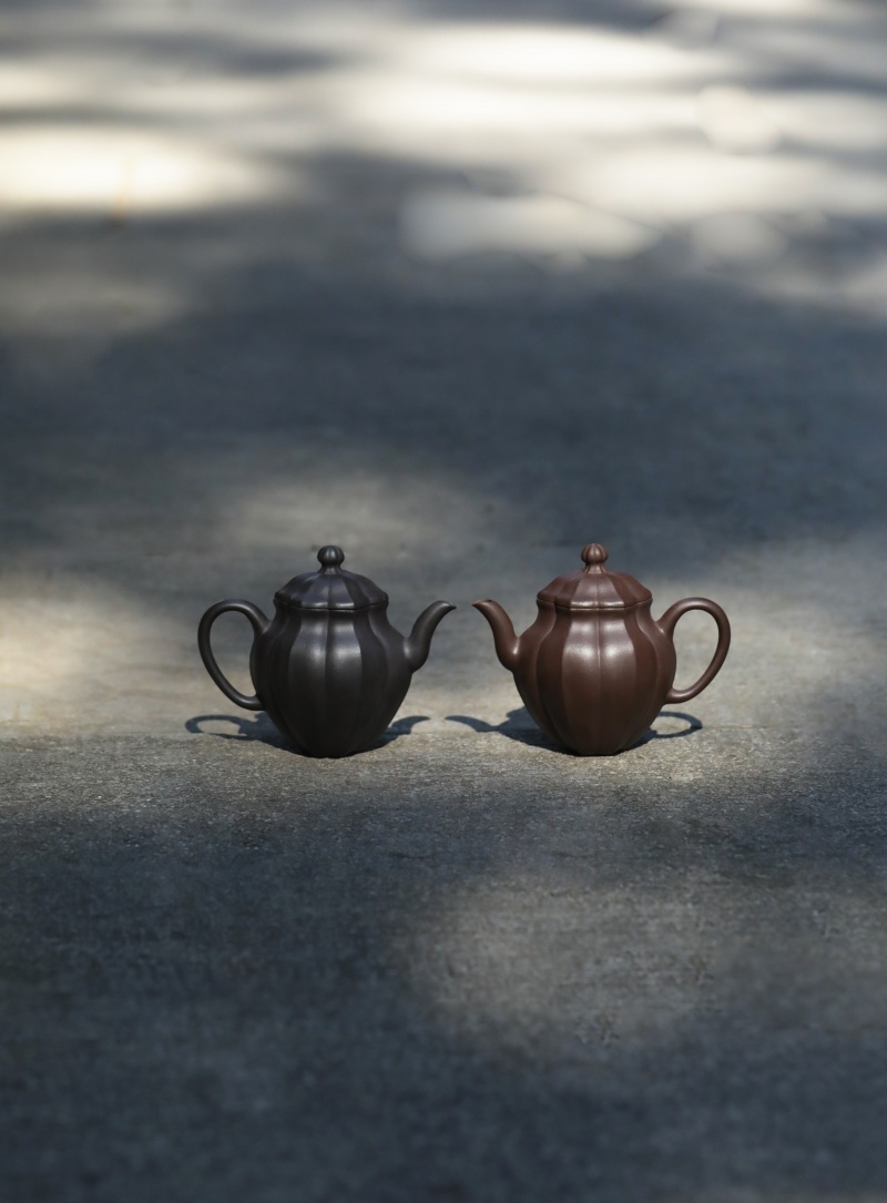 水仙宫灯二式通体呈水仙瓣式,将筋纹与块面巧妙结合,生动呈现出水仙花挺拔且富有生机的姿态。花瓣勾勒细腻,筋纹阴阳交错。整体秀美非凡,柔美中棱角分明,又不失圆润流畅。流把设计纤细灵动,壶底设计巧妙,一点收缩,将全壶筋纹精妙汇聚于壶底中心,其出水流畅,特为事茶断水收水更佳。